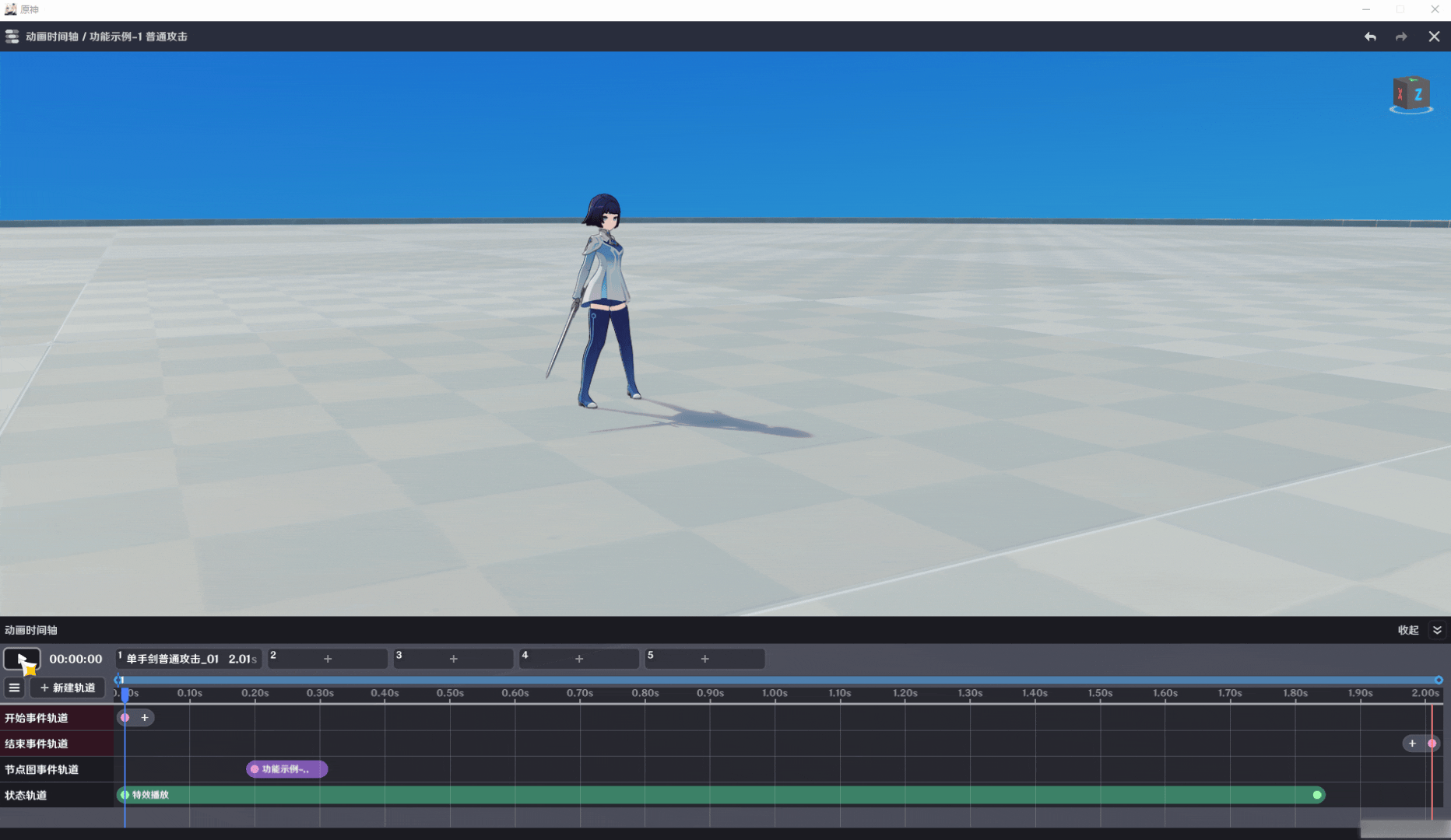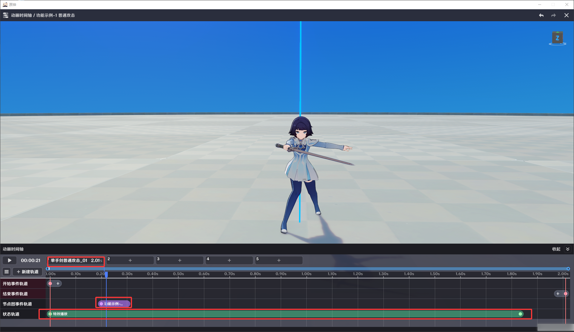 角色有挥剑动画 | 【状态轨道】添加特效,选择单手剑,配置挂接点【GI_WeaponR】 挂点可在【角色】-【组件-自定义挂接点】查看 |
