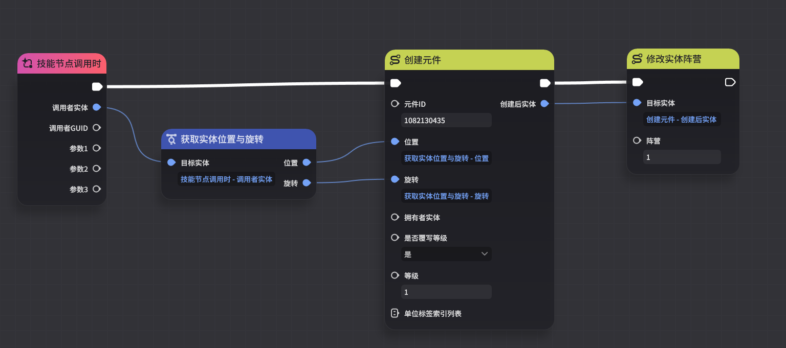 结果-1 | 召唤小怪 | 【执行节点】:使用创建元件,在使用技能的角色位置创建一个小怪 | |