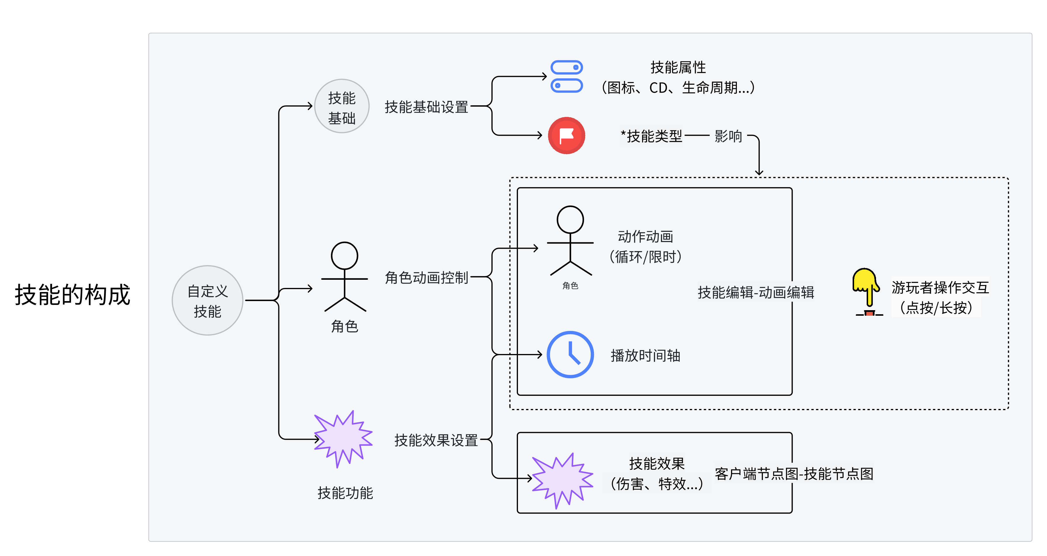 普通技能:点按施放技能;仅支持一次性技能动画;可在动画中任意帧插入技能效果(如:武器挥砍时才攻击)