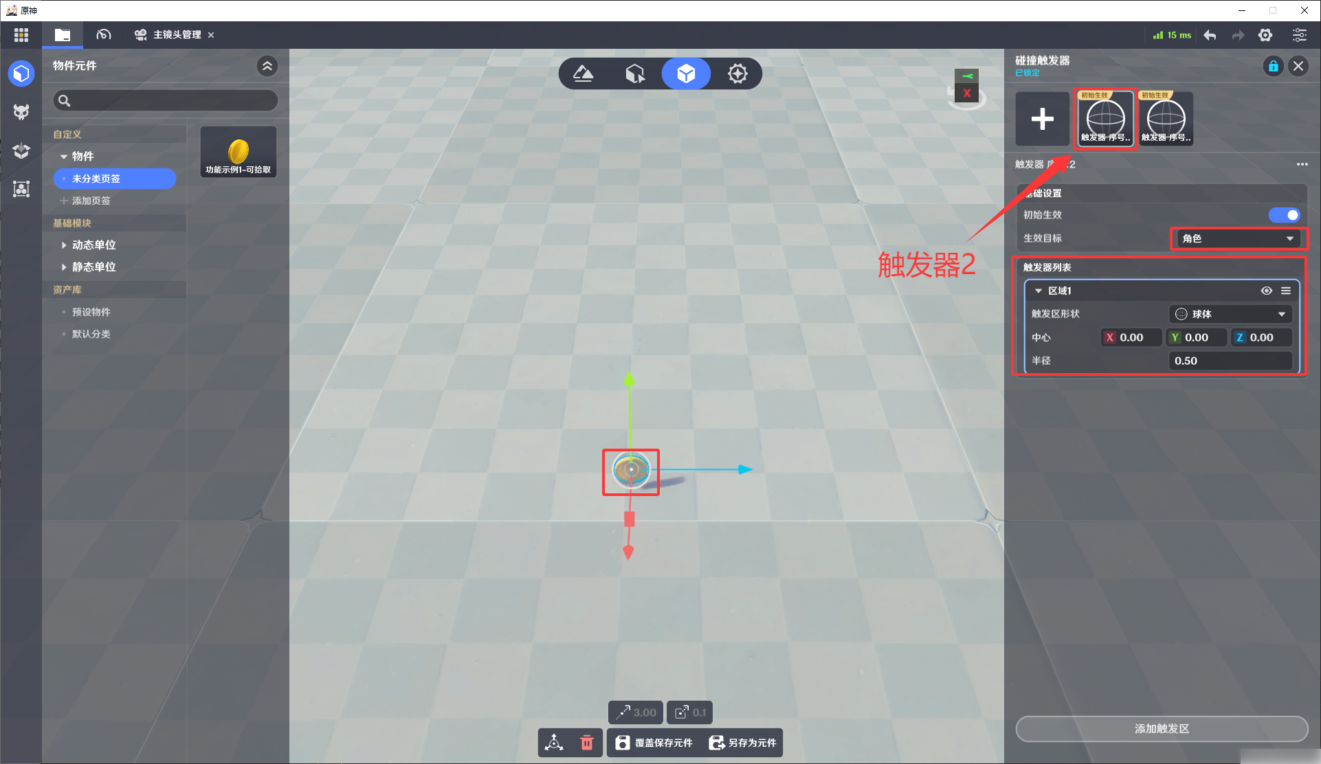 添加【组件-碰撞触发器】,并添加2个触发器,1个用于检测可拾取范围让道具跟随,1个用于检测拾取到了让道具销毁(即玩家成功拾取)