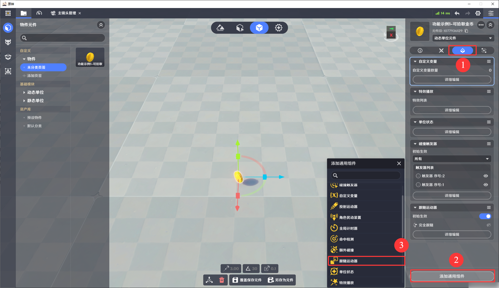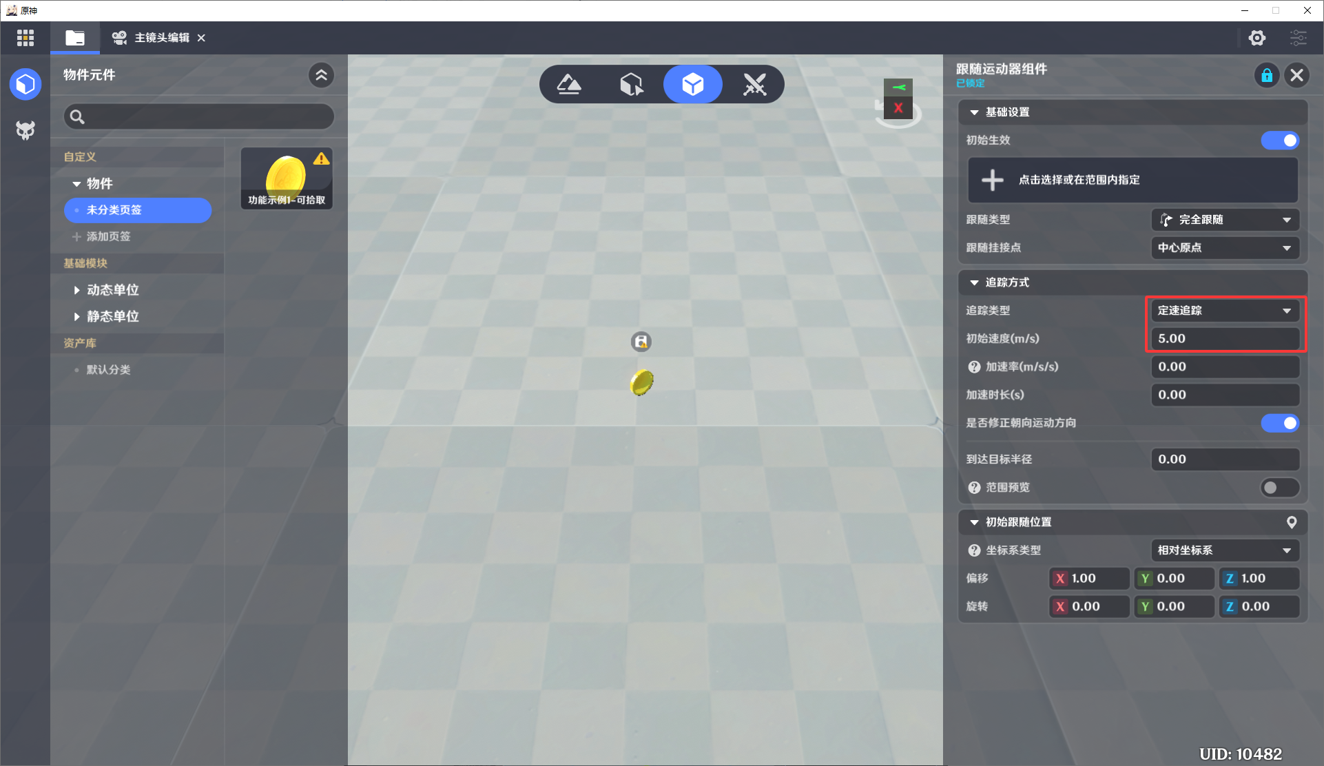 学习目标:了解使用跟随运动器制作吸附或定速跟随的道具,可用于制作角色拾取武器、施放跟随性放置技能、吸收掉落物等效果