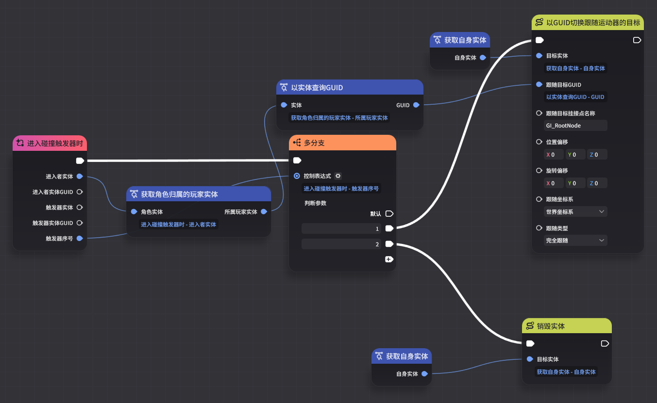 结果 | 道具跟随玩家 | 【执行节点】:使用【切换跟随运动器目标】使玩家周围道具跟随玩家 **由于【角色】不具有GUID,所以需要获取【角色归属的玩家的GUID】用于跟随 | |
